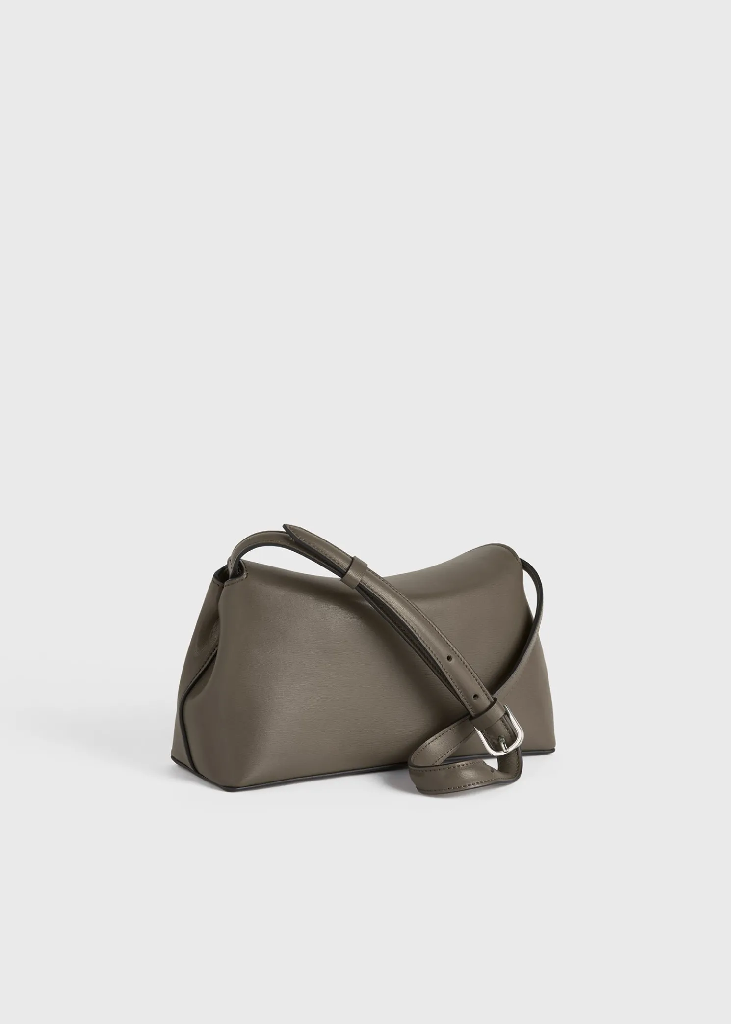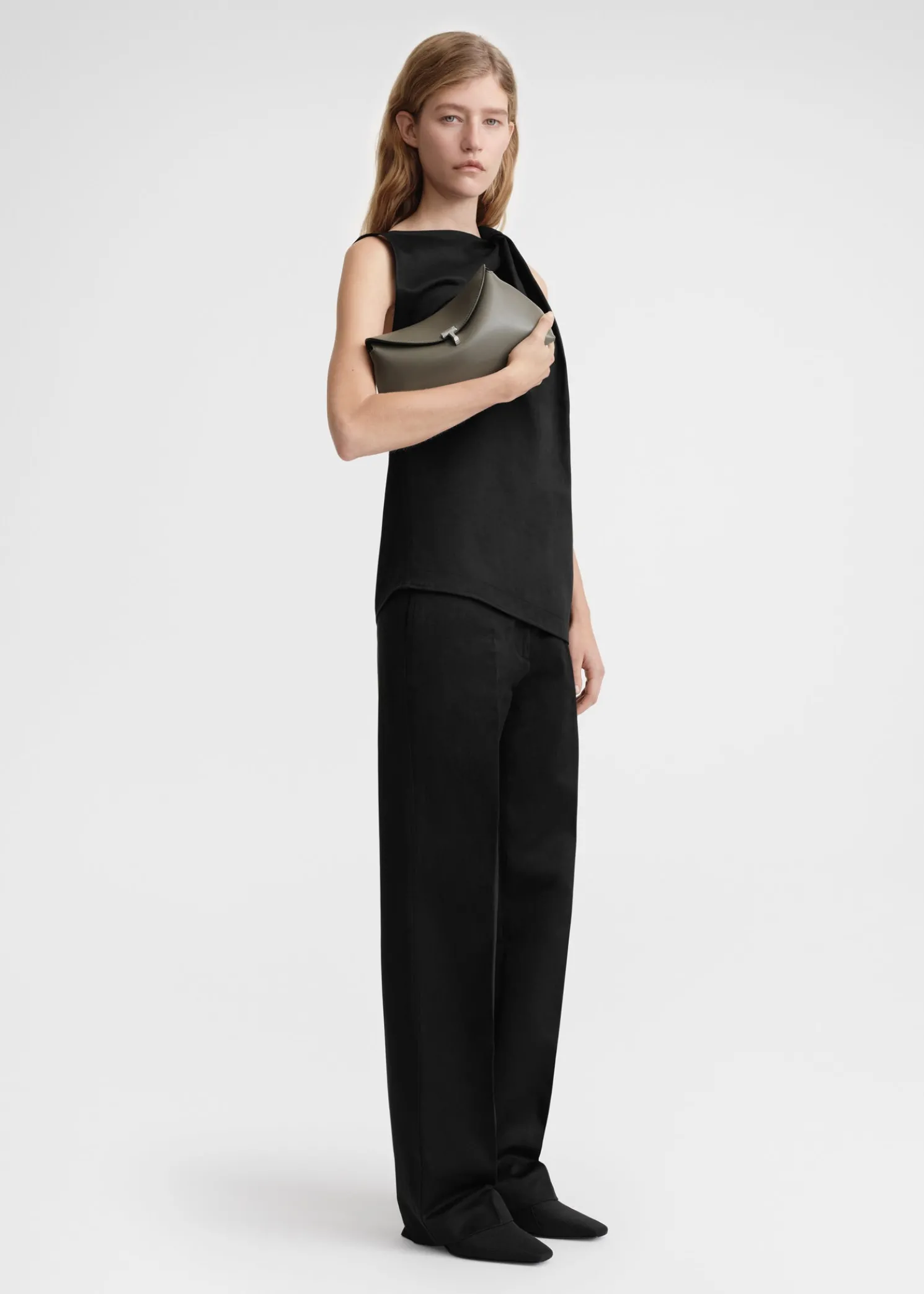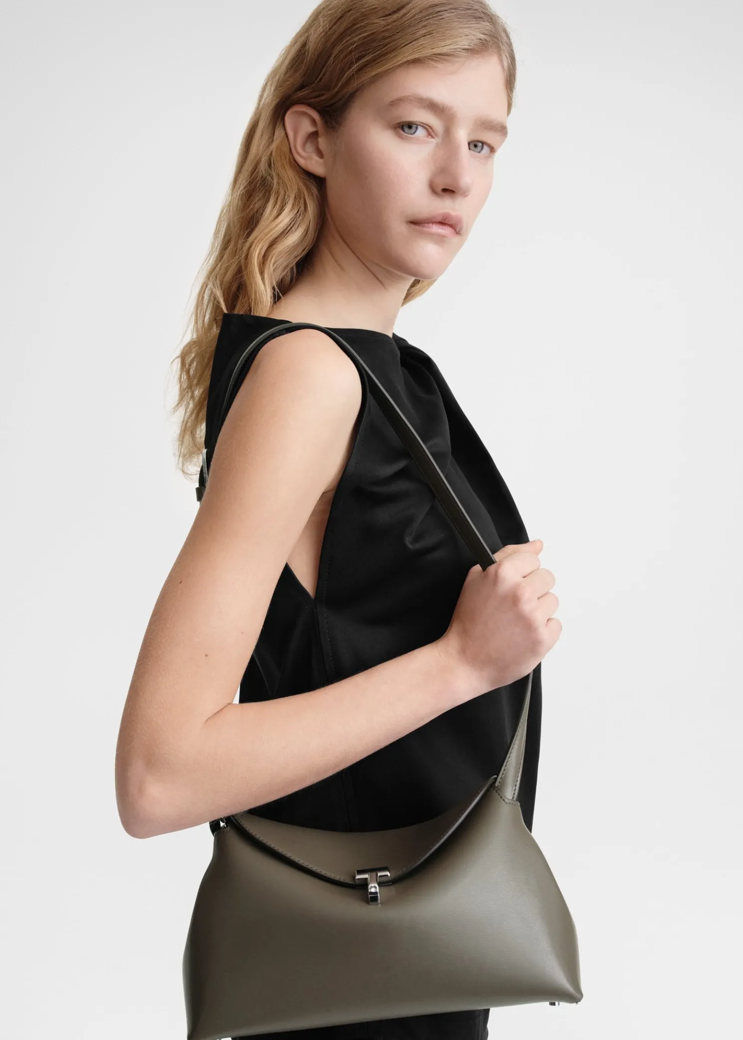 Sculptural TOTEME clutch bag named T-Lock after the silver-tone metal twist lock securing the curved top flap. It’s crafted in Italy from smooth leather and opens to a beige microsuede interior fitted with a leather card slot. Hold it in your hand or carry it across the body using the optional strap.
