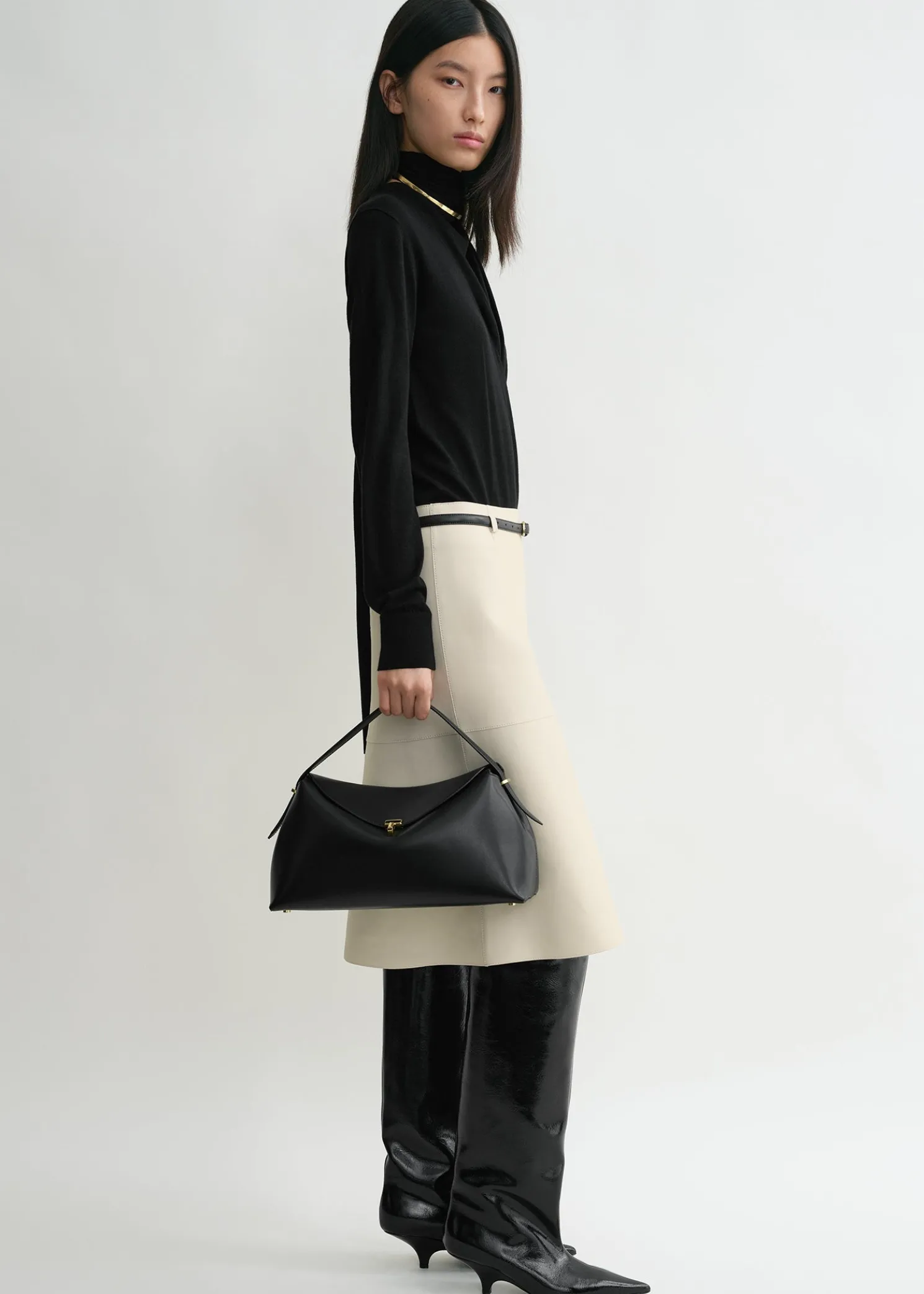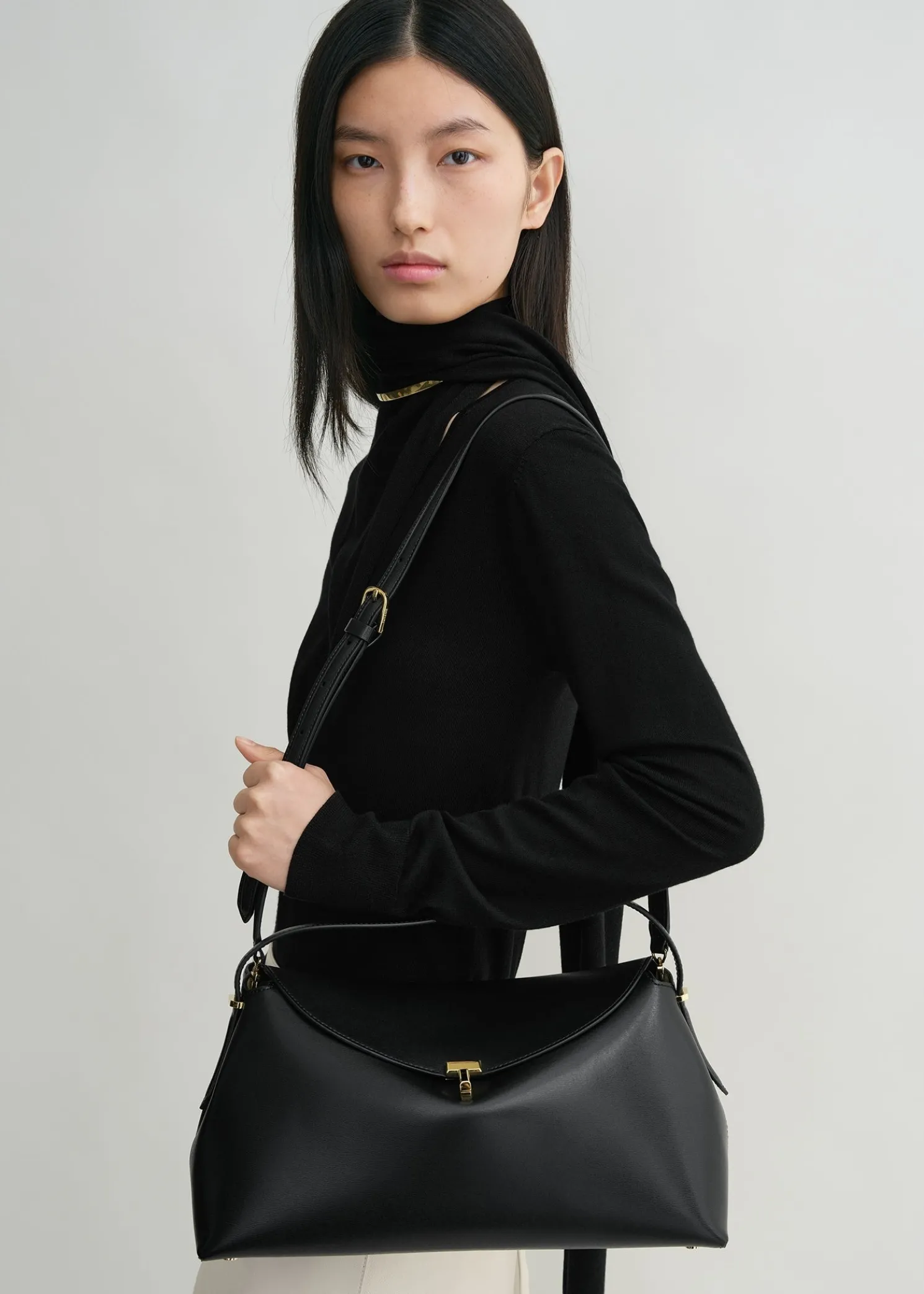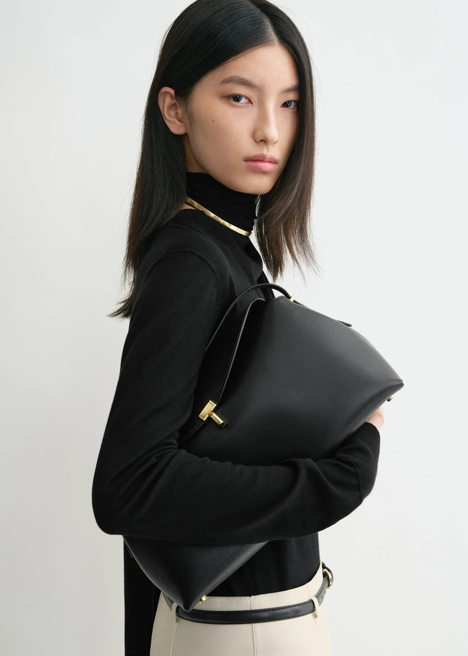 nEveryday TOTEME bag sculpted with a curved topline that complements the shape of the hand and arm. It is handcrafted in Italy from smooth leather finished with a golden metal T-Lock and protective feet, then lined in beige microsuede fitted with two leather slip pockets. Carry it from the top handle or from the detachable and adjustable shoulder strap for different styling options.