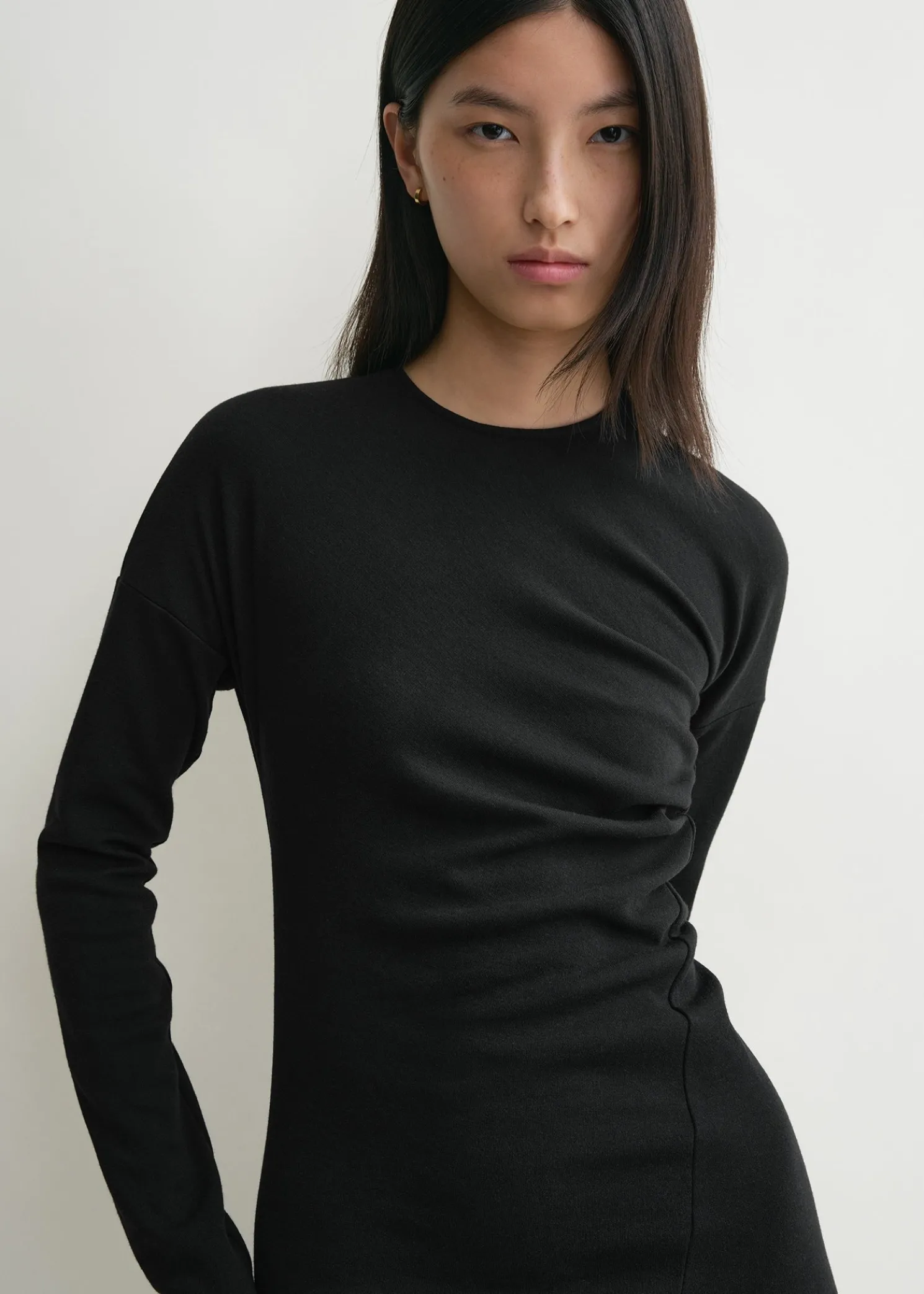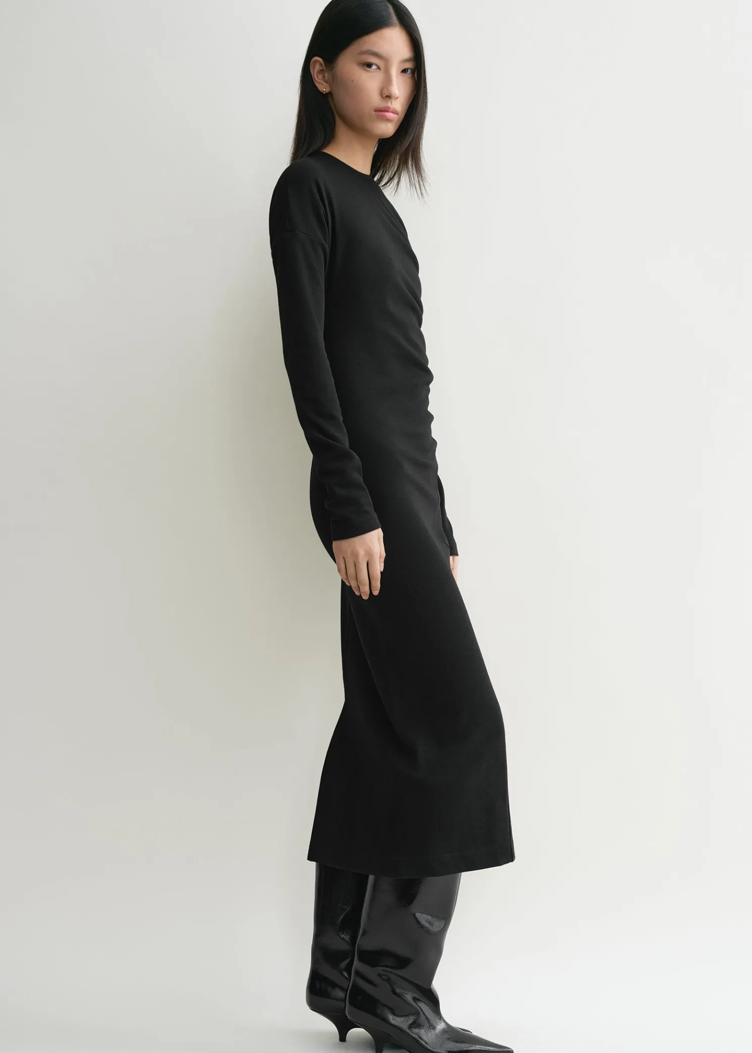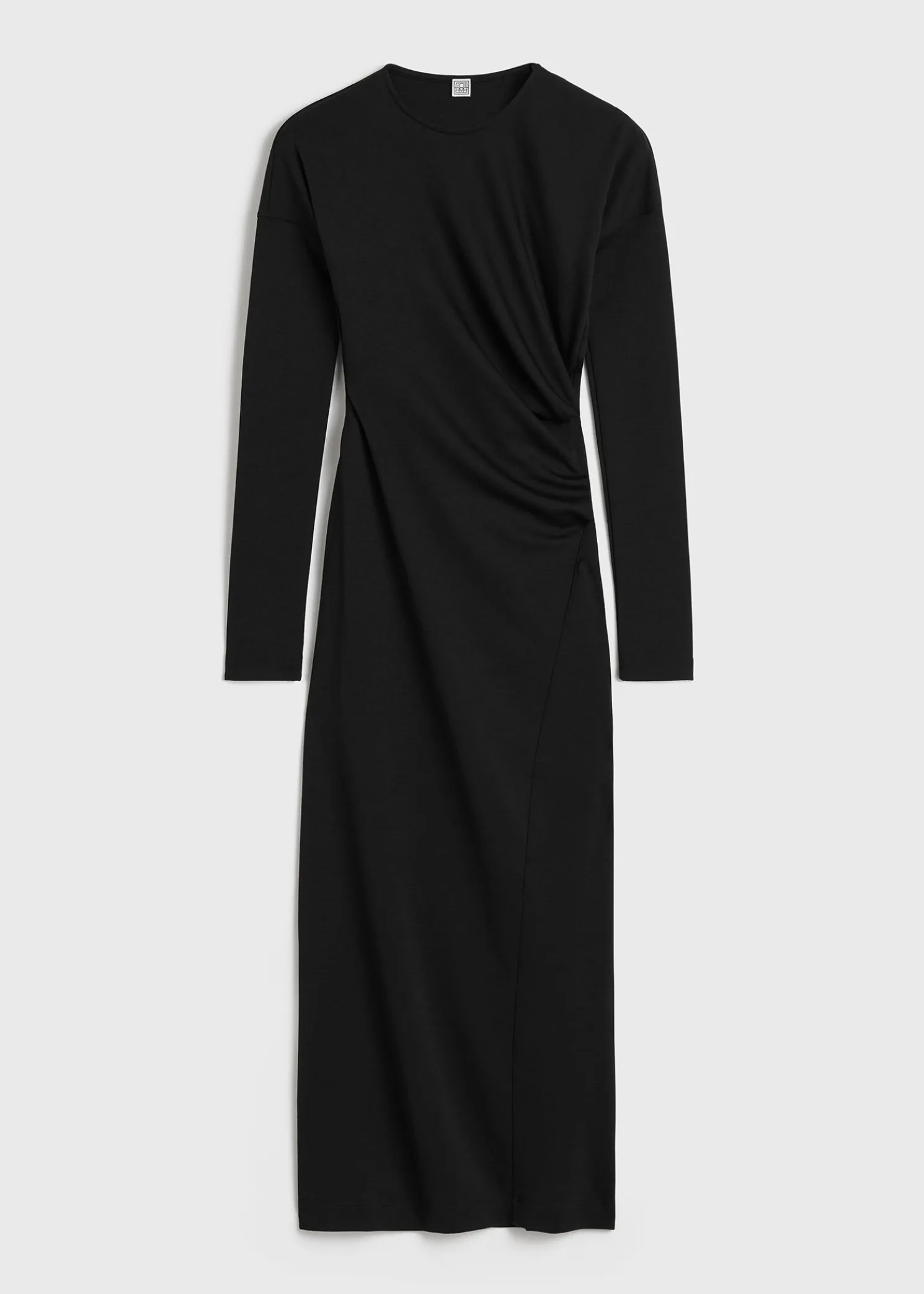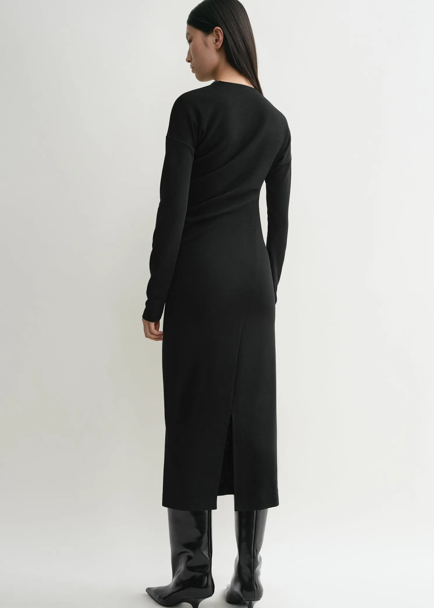 Slim TOTEME midi dress constructed with an asymmetric silhouette that twists playfully at the waist. It is made from stretch jersey with concealed zippers on the shoulder and side for a body-hugging fit. Style with statement boots.