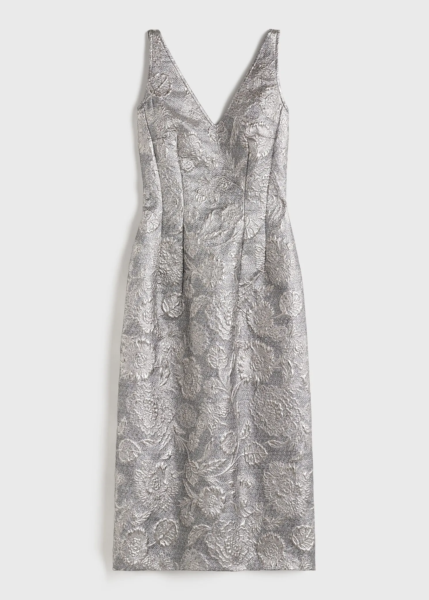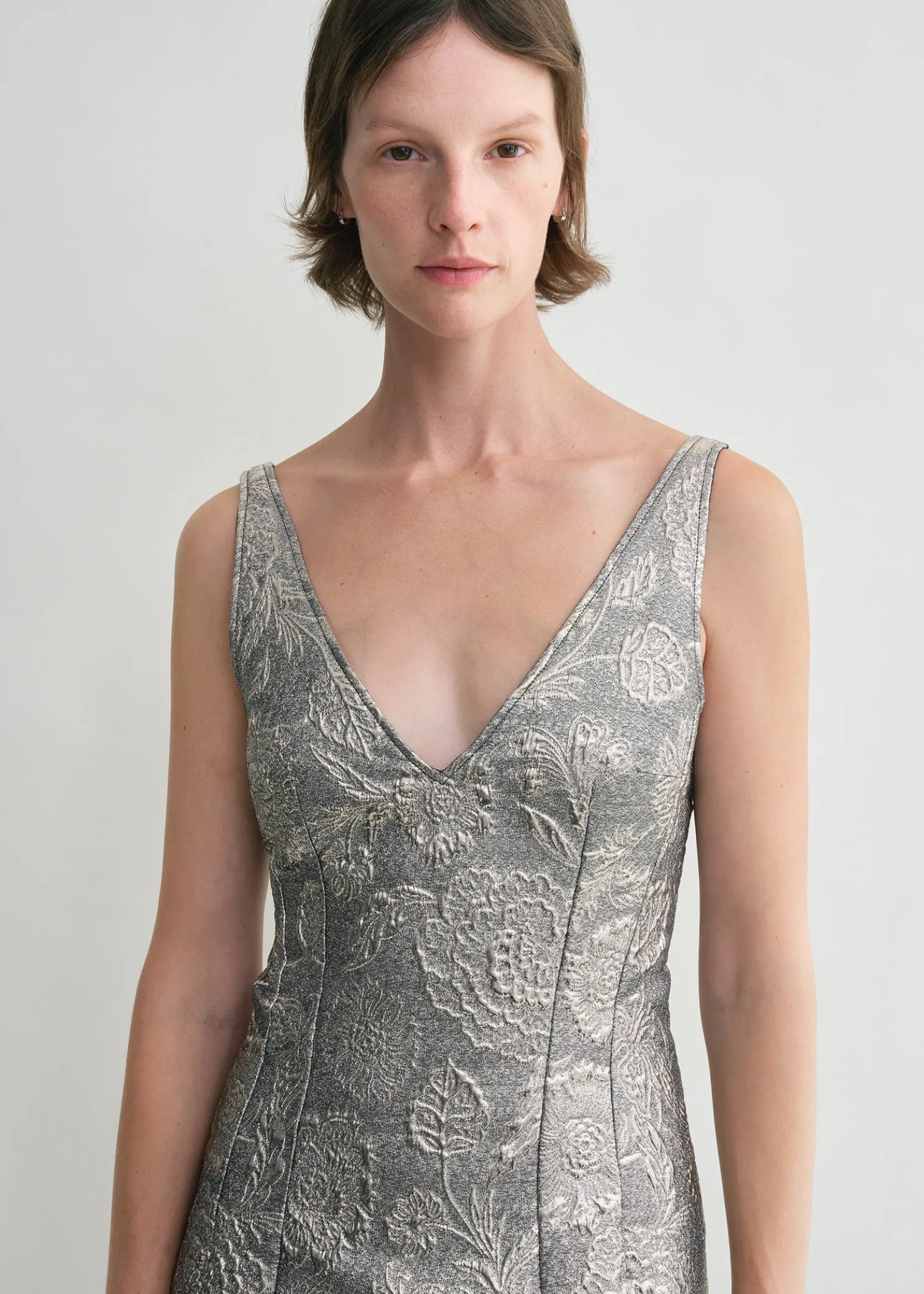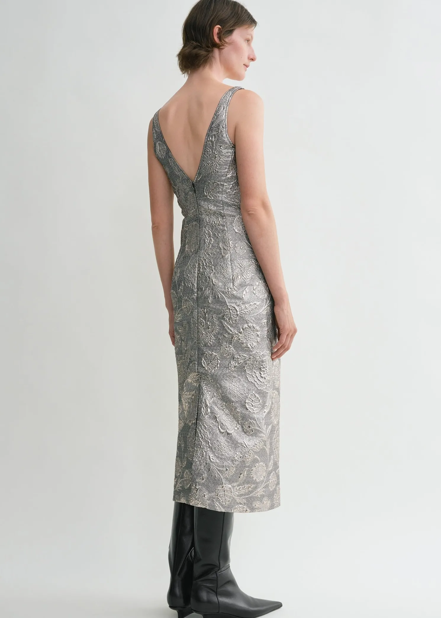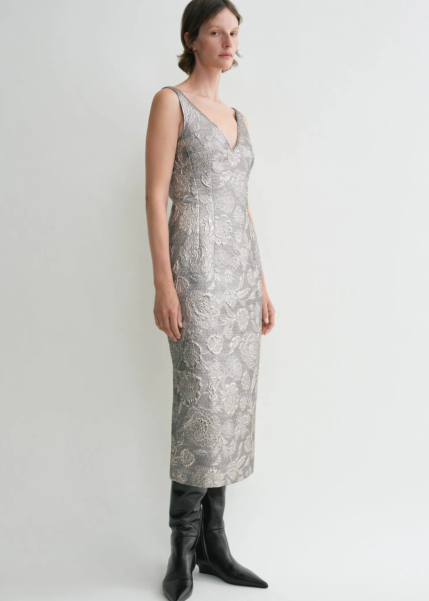 Elegant TOTEME V-neck dress crafted from silver floral brocade with a decadent matelassé finish. It has a slim silhouette constructed solely with sculptural darting and fastens with a concealed back zipper leading to a fully lined interior. Turn it into a directional ocassion look by teaming it with slouched boots.