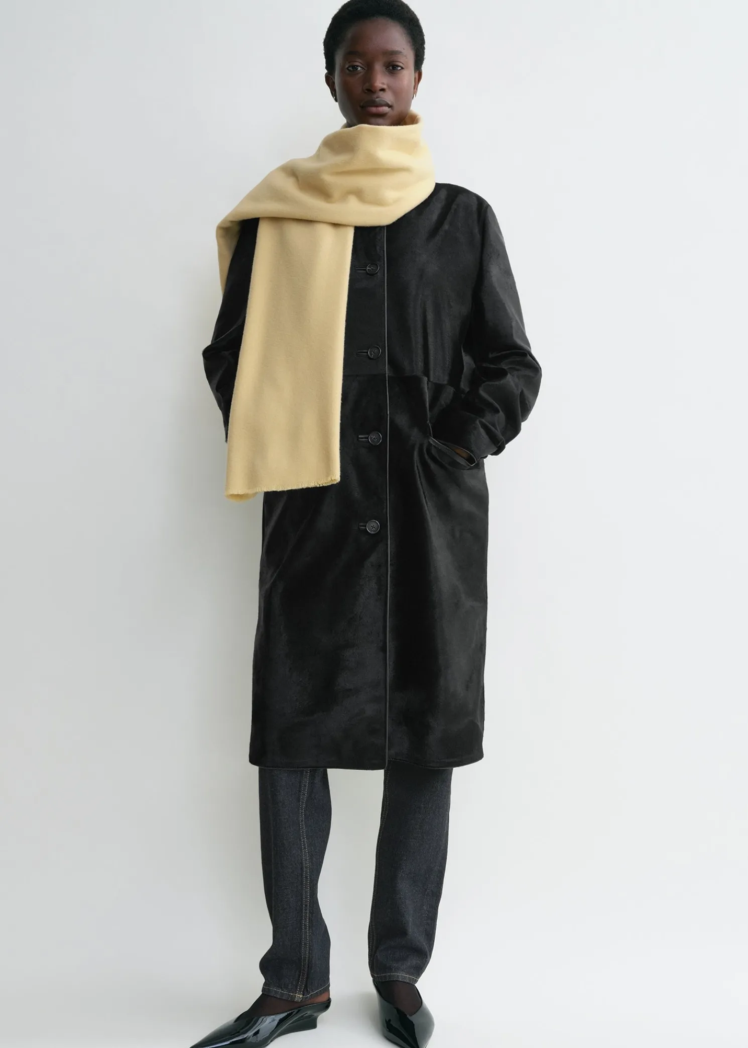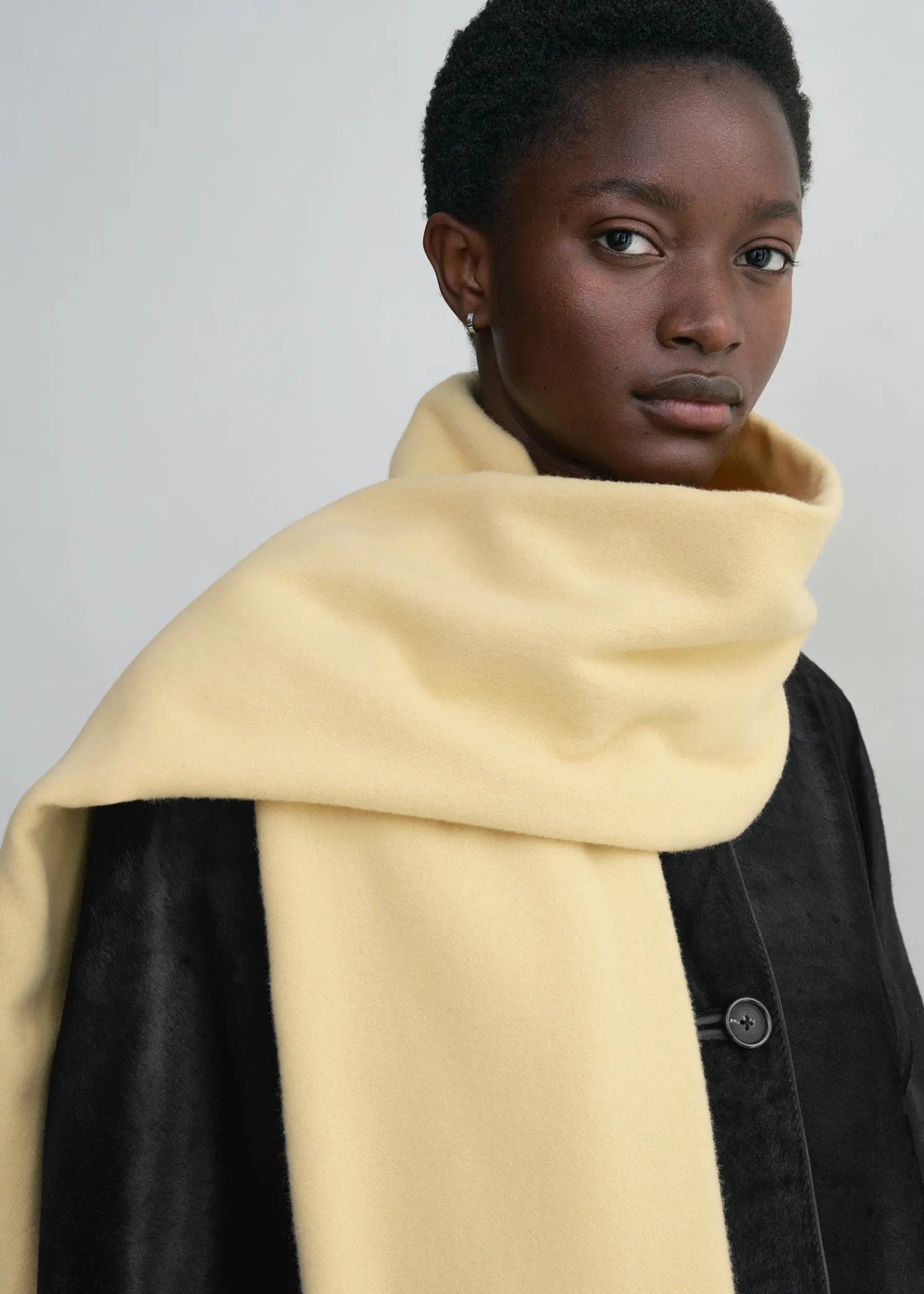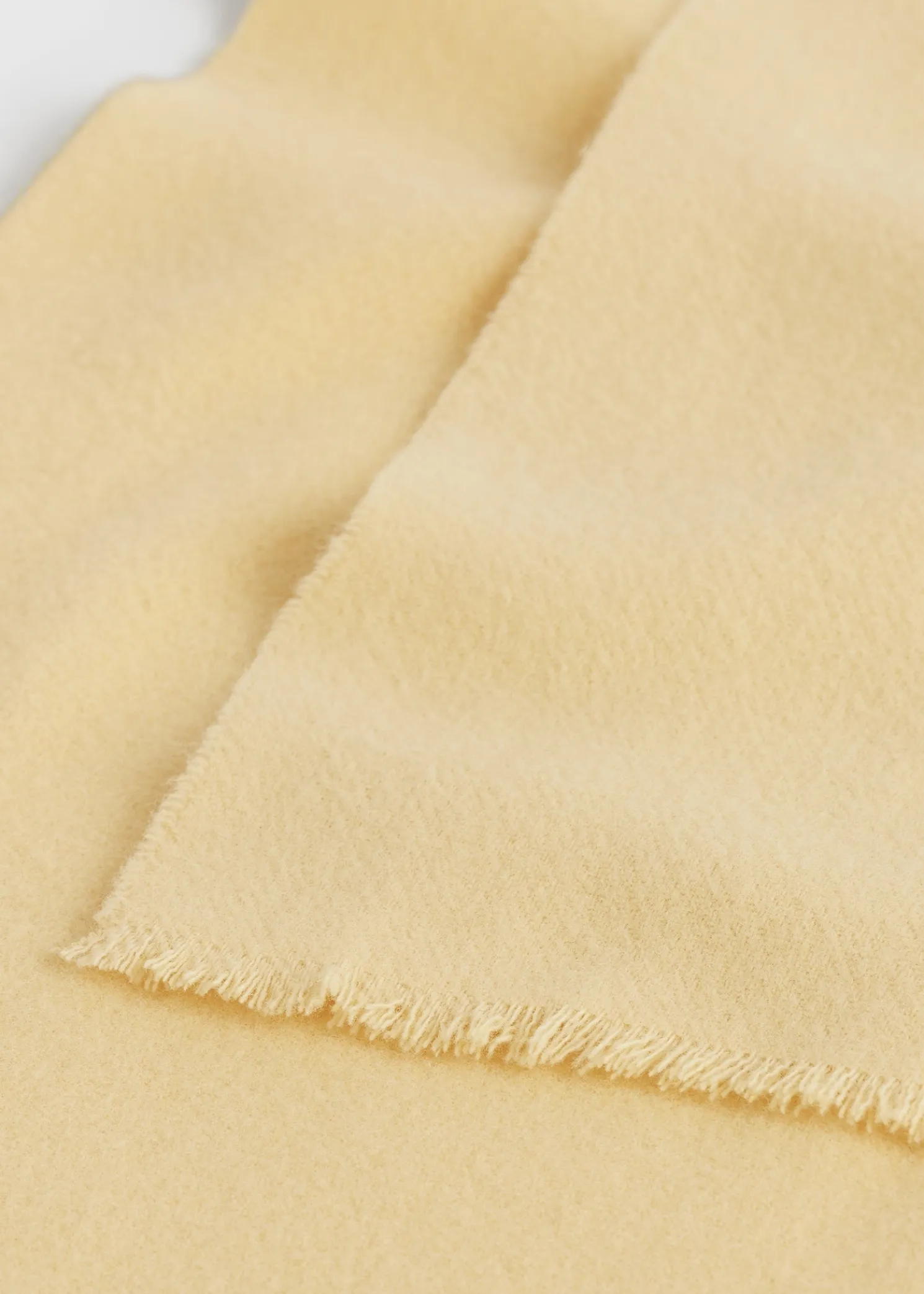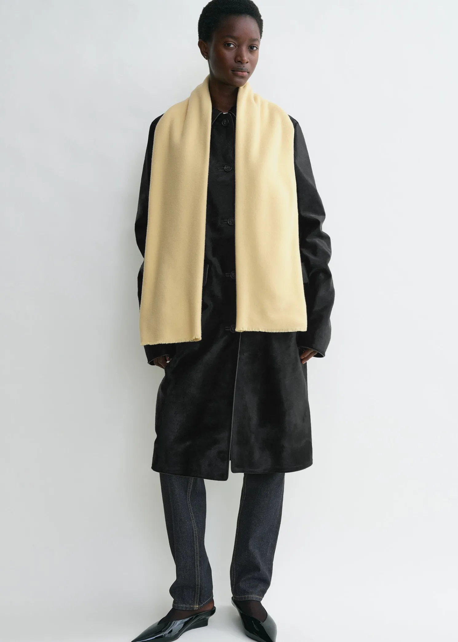 A wider, shorter iteration of TOTEME’s classic wool scarf outlined with a 170x70cm frame. It is crafted in Italy from light and soft virgin wool finished with fringed edges, adding subtle texture to classic winter edits.