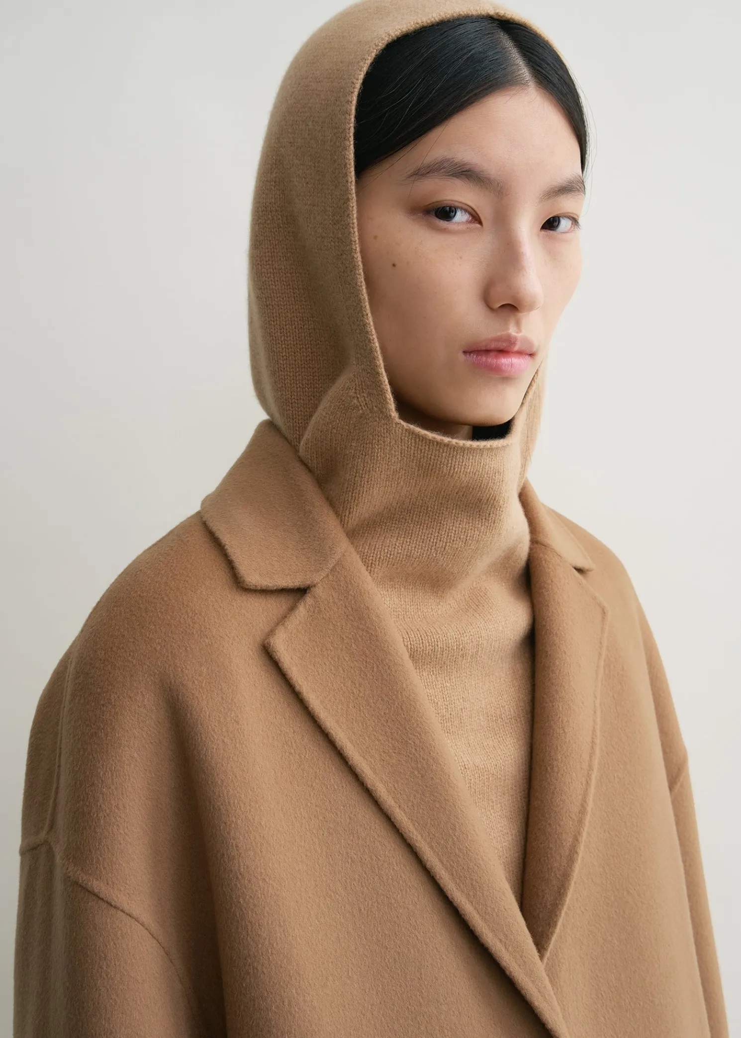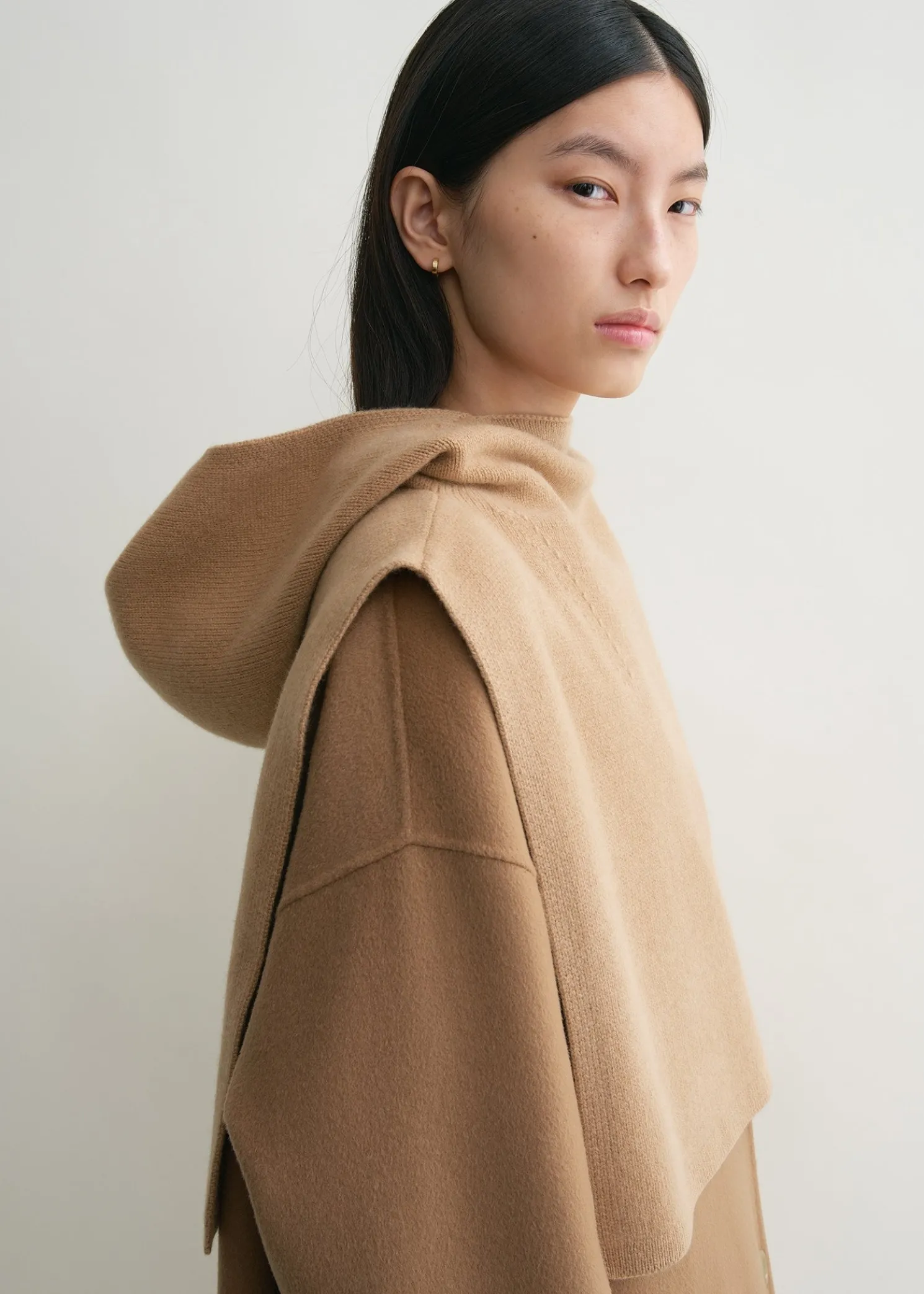 Hooded TOTEME bib to stay warm in style. It is knitted from a mid-weight blend of wool and cashmere that feels soft and cozy against the body. Wear it in cold weather with tonal accessories.